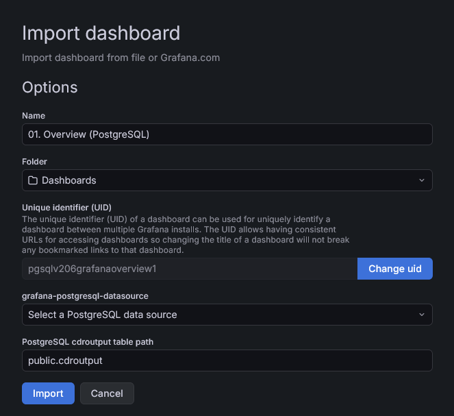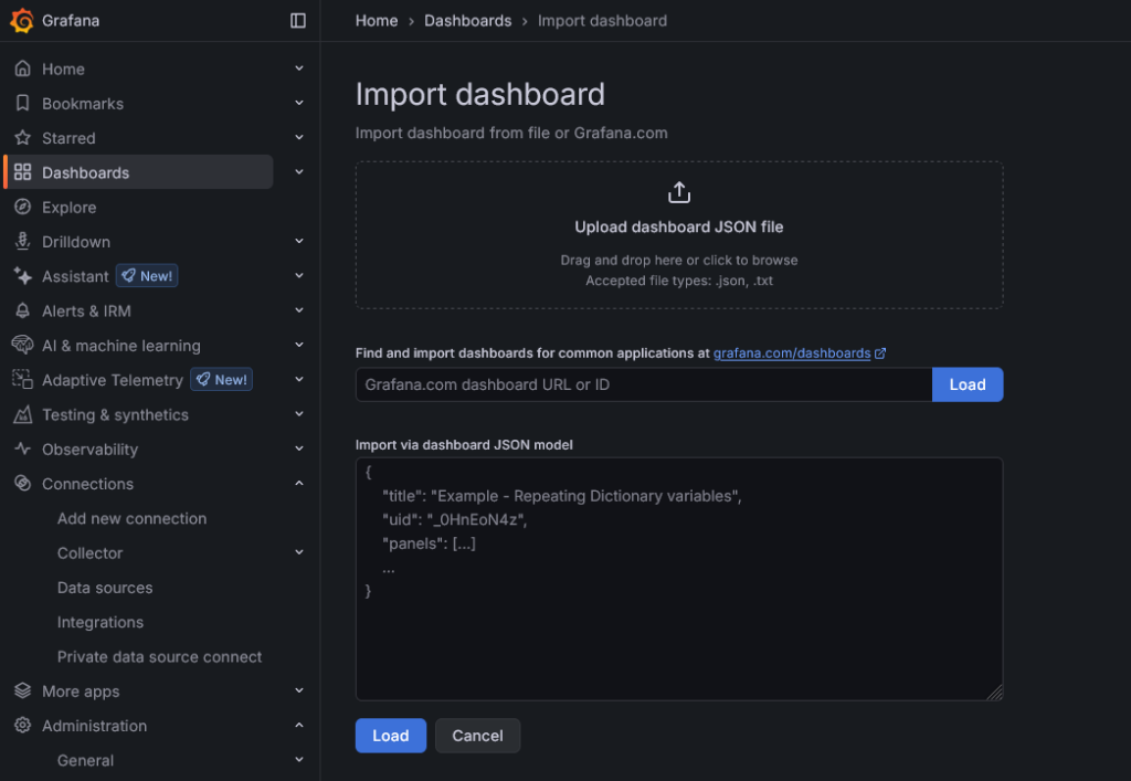 Once you have your packages, you can unzip them, and drag and drop them into the Dashboard creation screen, which is found in Grafana by going to the Dashboards page and clicking New > New Dashboard in the top right, then select Import Dashboard